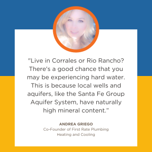 “Live in Corrales or Rio Rancho? There’s a good chance that you may be experiencing hard water. This is because local wells and aquifers, like the Santa Fe Group Aquifer System, have naturally high mineral content.” — Andrea Griego, First Rate Plumbing Heating and Cooling